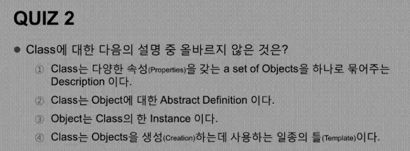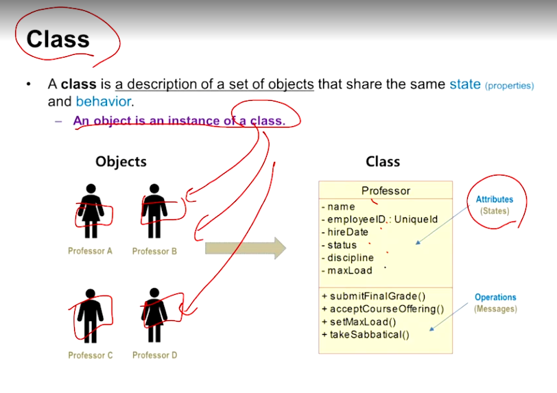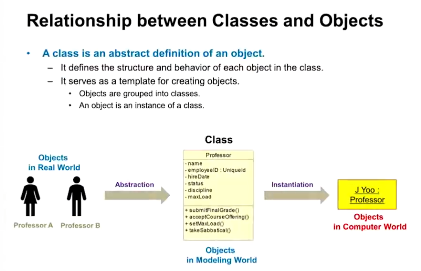 - Class는 Object를 만드는 템플릿이고, Object는 Class에서 인스턴스화 된 것이다. -실제세상-SW world-Operating 위에서 실제로 돌아가는 인스턴스 관계 - 실제세상의 물체를 보고 공통의 프로퍼티/오퍼레이션을 묶어 SW의 Class화를