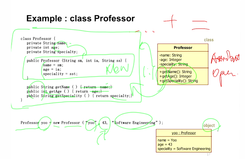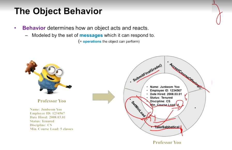예를 들어 유 교수님을 빗대어 말하면 6가지 정보에 대한 state(Attribute)가 있고, 이를 접근하기 위한 behavior(function/Method)가 있음. 이때 기본적으로 Encapsulation을 통해 정보들을 숨기고 public behavior를 통한 접근을 허용하는 방식으로 설계를 진행하며 이는