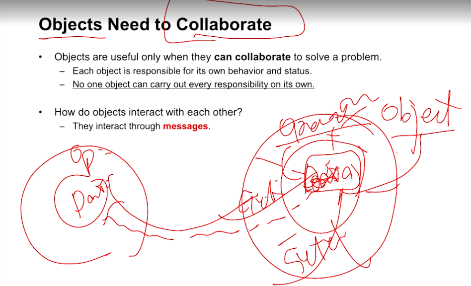- Object는 Collaborate가 필요하며 객체지향은 절차지향과 다르게 data manipulation 관점 이 다름