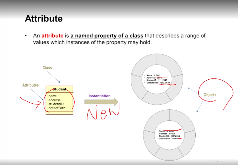 란 Object를 만드는 틀(=템플릿)이라 생각하면 됨- Object들의 공통적인 특성들을 Attribue/Operation으로 묶는 것이고, Class를 통해 공통의 Attribue을 가지나 data가 다른 Instace를 만들어 냄