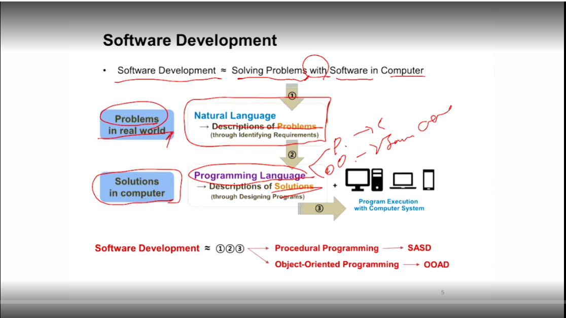 는 컴퓨터에서 동작하는 스프트웨어로 푸는 것을 말함 - 실제 환경의 문제를 정의 후 컴퓨터 언어로 바꾸고 동작가능한 프로그램으로 구현하는 것까지를 Software Development라고 말한다