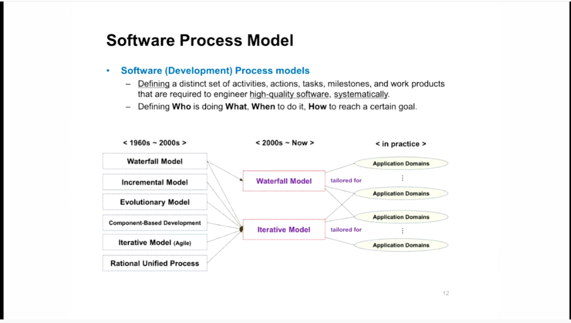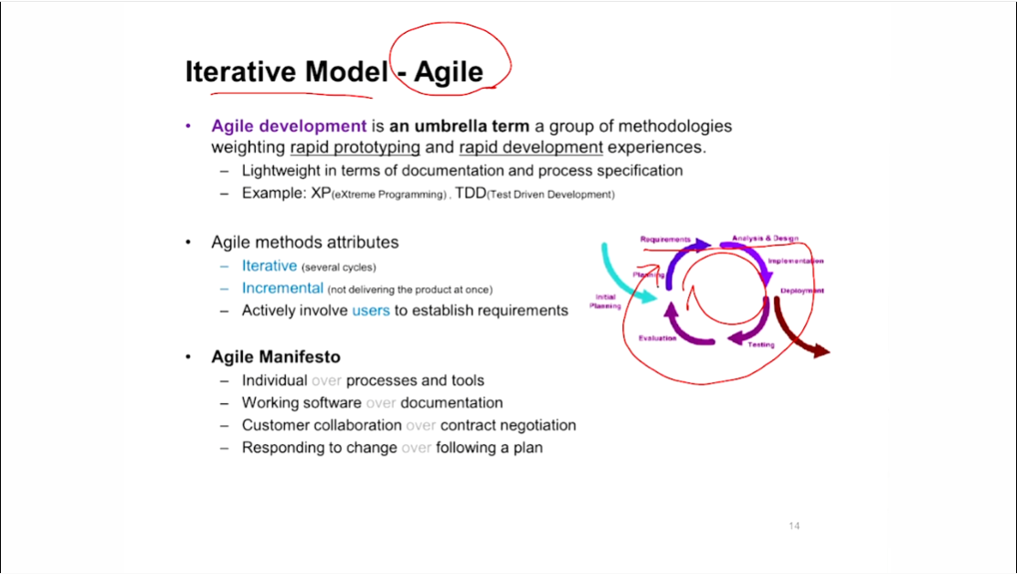 : 요구사항을 한번에 다 파악하기 힘드니 파악할수 있는것 만큼 파악하고 추후 나오는 요구사항들을 다시 들고와서 업데이트 하는 방식 - 요구사항을 작은 단위로 매번 수집 -> 분석/디자인 -> 태스팅/검증 -> 평가를 작은 iteration으로 쪼개서 반복적으로 진행하는 것을 말함