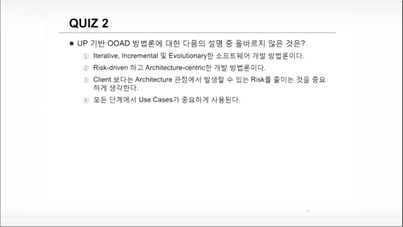Answer) 일반적으로는 다 맞는 말이지만, 굳이 하나 고르자면 1번(소프트웨어 개발 방법론은 UP를 말하긴함)