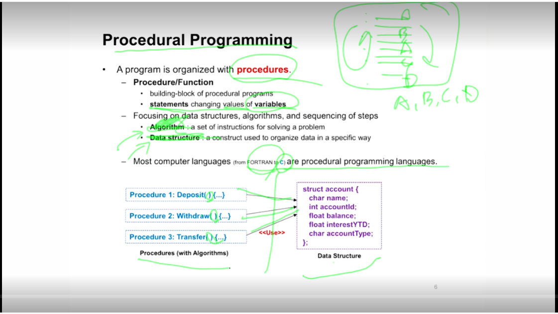 - variables values의 상태를 statements로 값 변경하는 Function 단위 포커싱이 절차지향 프로그래밍이다