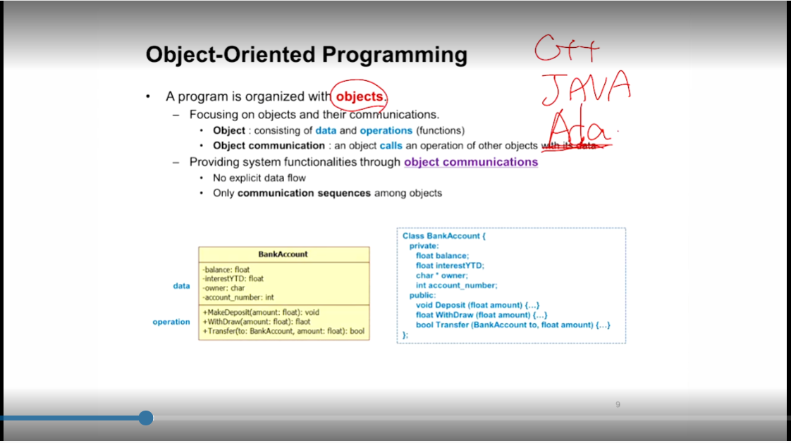 - C++/Java/Ada(인공위성/항공쪽에서 많이 쓰이는 안정한 프로그래밍 Language)와 같은 프로그래밍 언어가 객체 지향 프로그래밍 언어이며,