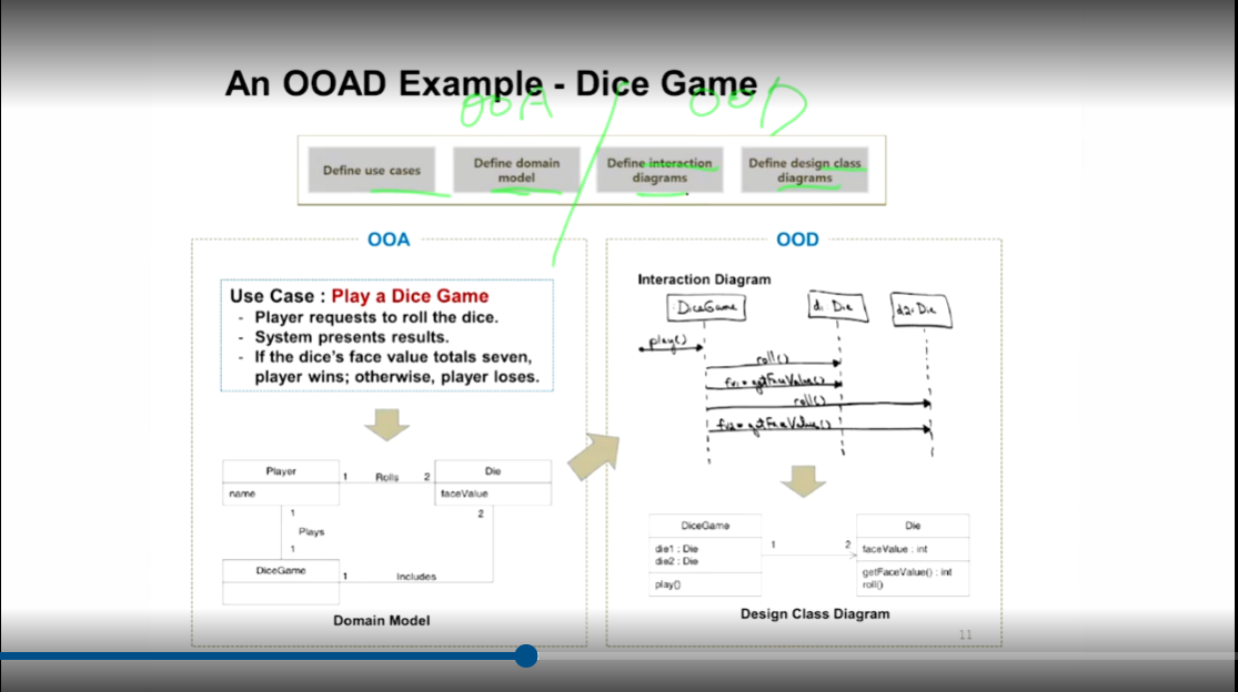 OOA : UseCase를 찾고 Object Define(Domain Model) OOD : Static Model(Class Diagram 정의), Dynamic Model(Sequence Diagram 정의)