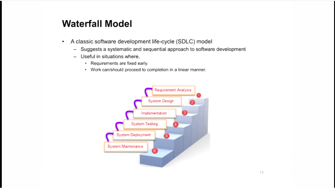 - 폭포가 순차적으로 위에서 아래로 떨어지는 것처럼 Analiysis -> Design .. 단계를 다 끝내고 순차적으로 나가야된다