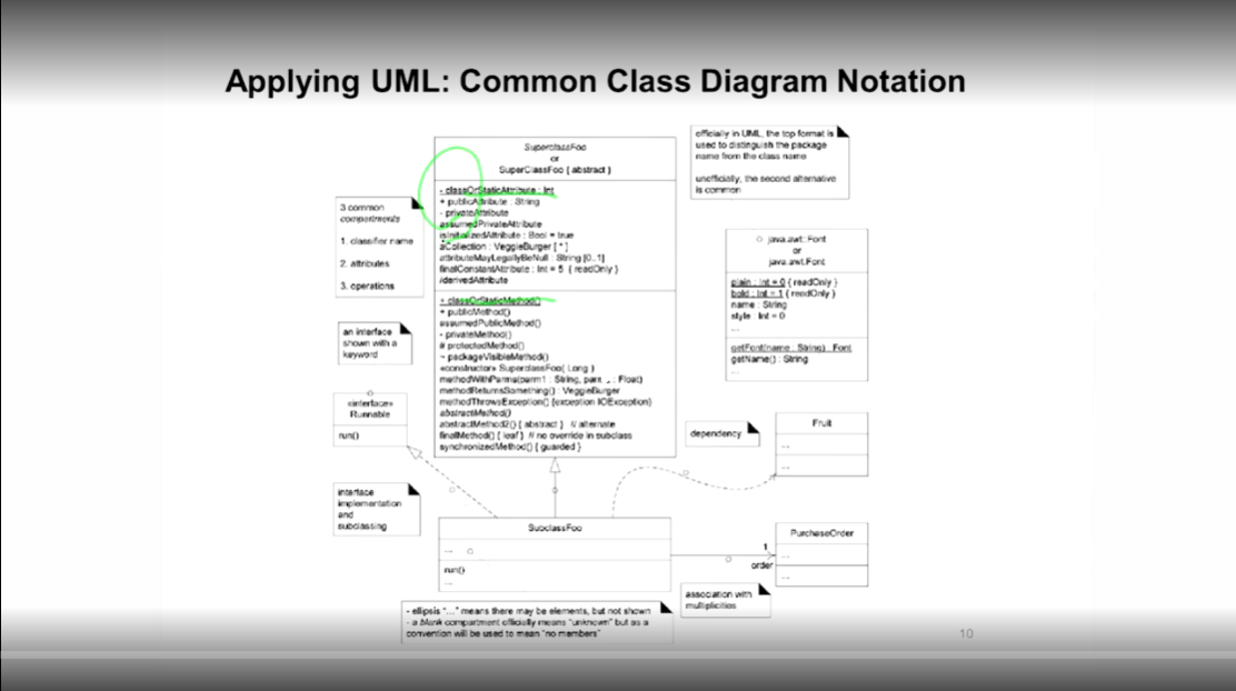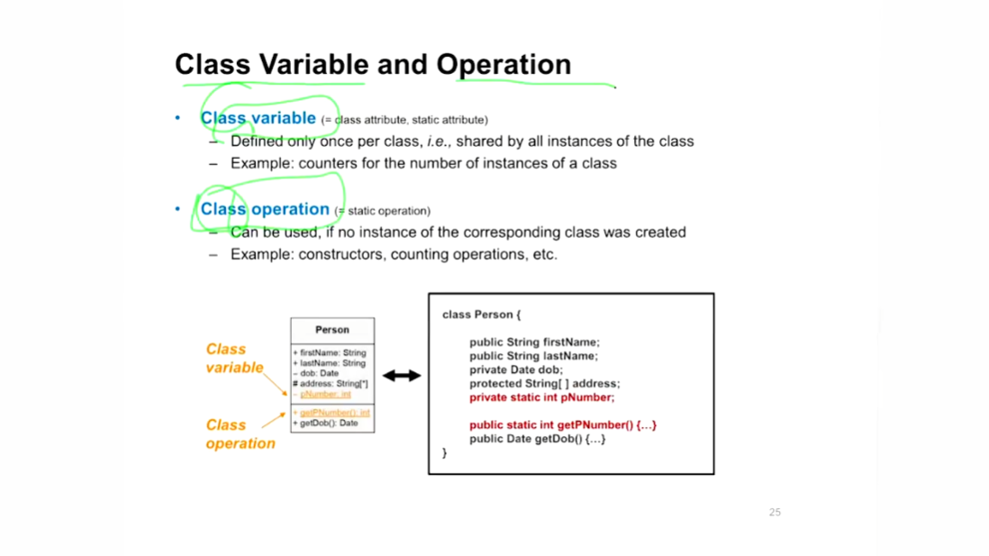 - static으로 인스턴스 생성 없이도 사용되는 변수/함수로 Attribute/Operation에 밑줄을 그어 표기