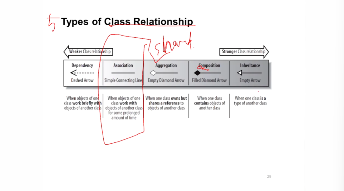 - 5 종류의 클래스 관계가 있으며, 오른쪽으로 갈수록 강하게 Coupled 되어 있음