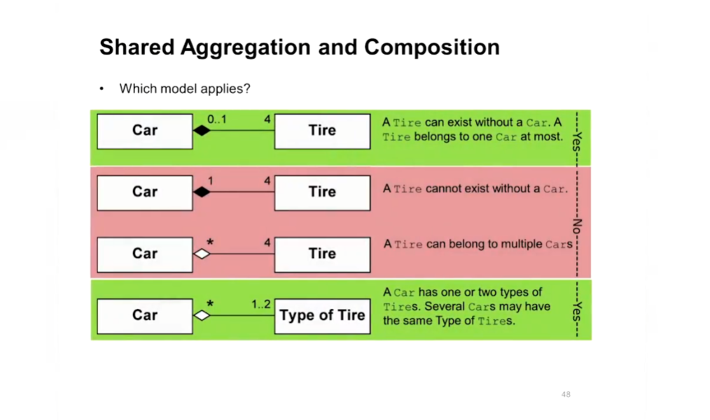 - 1개 또는 2개의 타입을 하나의 차가 공유는 가능(바퀴 교체할때 앞에만 교체하는 경우도 있음) => 추후 디자인 패턴 때 Aggregation에 따른 관계를 더 자세히 다룰 예정. 지금은 사라지냐/안사라지냐로 알고 있어도 될듯함