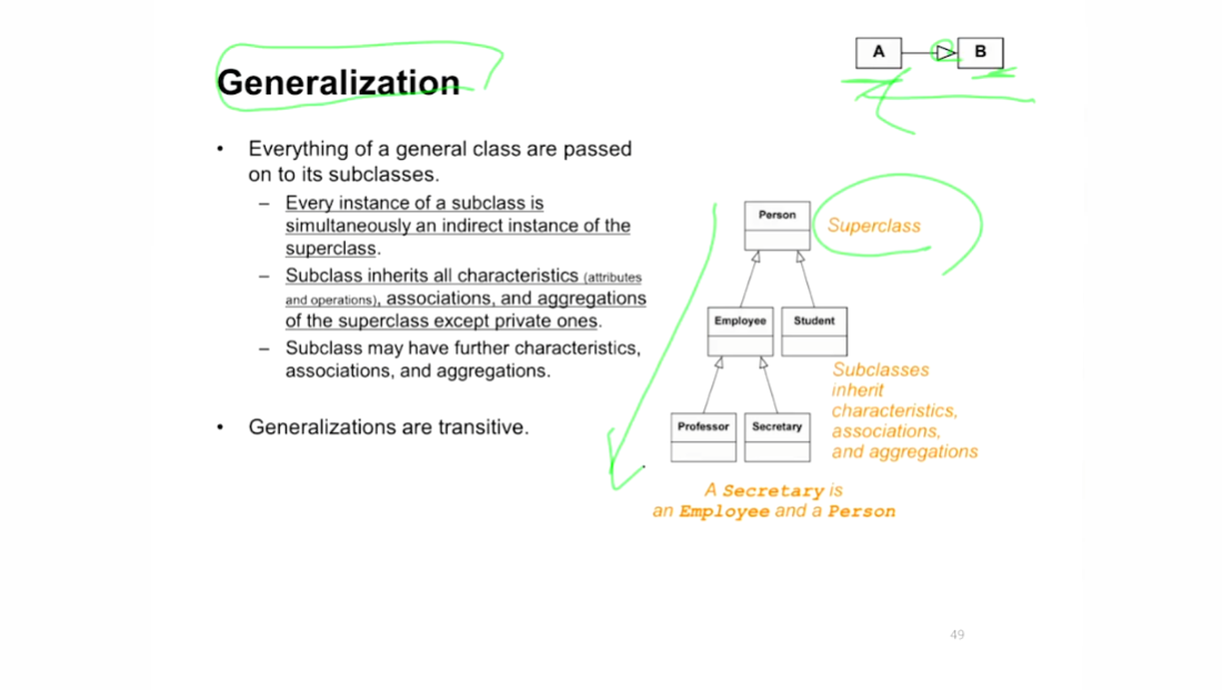 - parent class의 모든 Association 관계 + Attribute/Operation들을 다 SubClass가 물려 받음