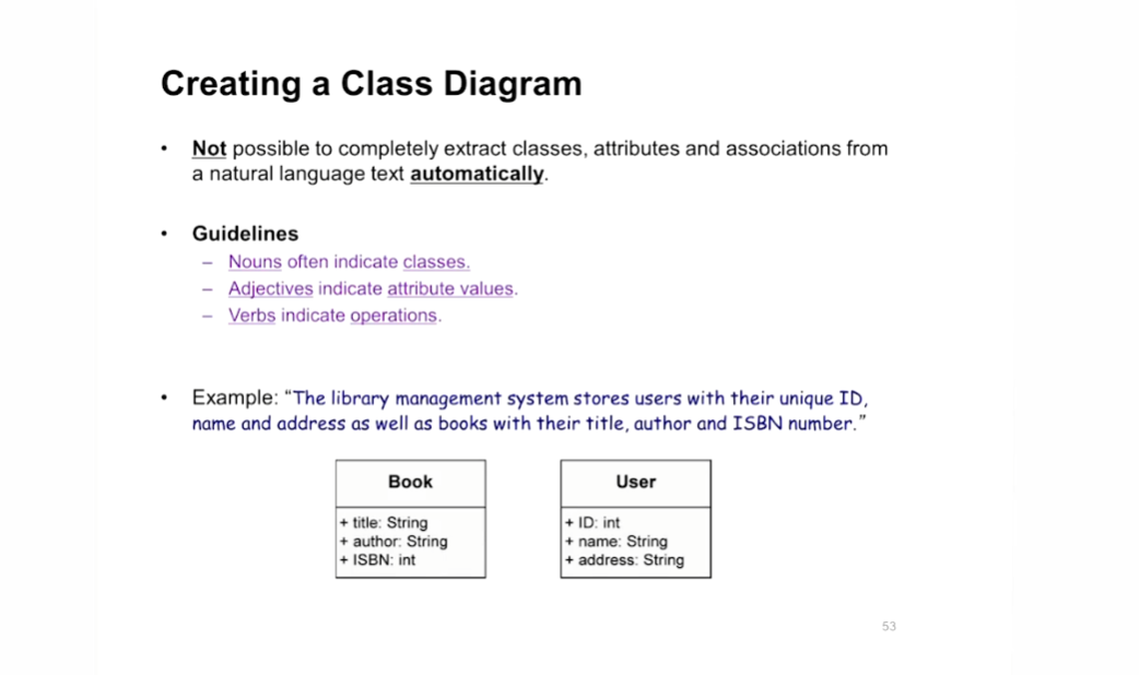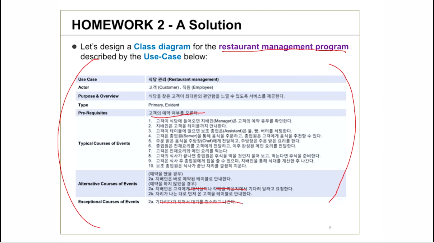 - 명사는 클래스를 말하고, 형용사는 어트리뷰트, 동사는 operation을 말한다곤 하지만 경험을 잘 살려 작업해야함