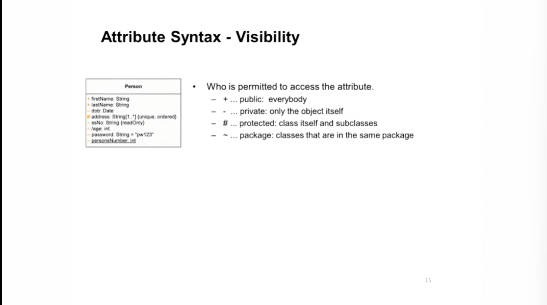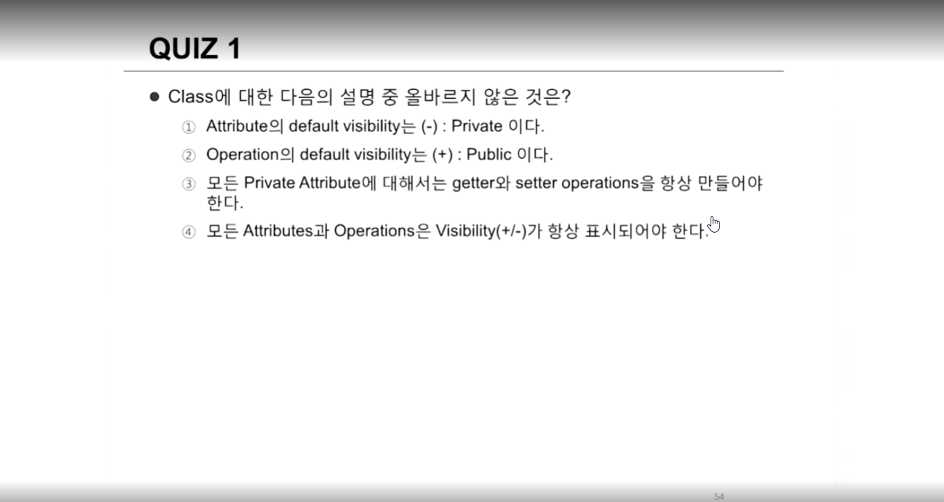 - 정답 4번, Attribue default private, operation default public!
