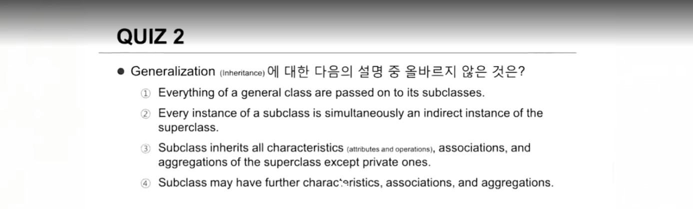 - 부모 클래스의 Public한 Attribue/Opertion만 내려감. Private한건 내려가지 않음