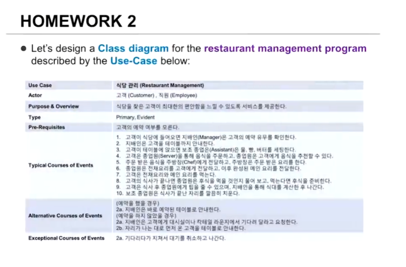- Class Diagram을 한번에 잘 그리는 방법은 없음.(There are no silber bullet in SW Architecture)