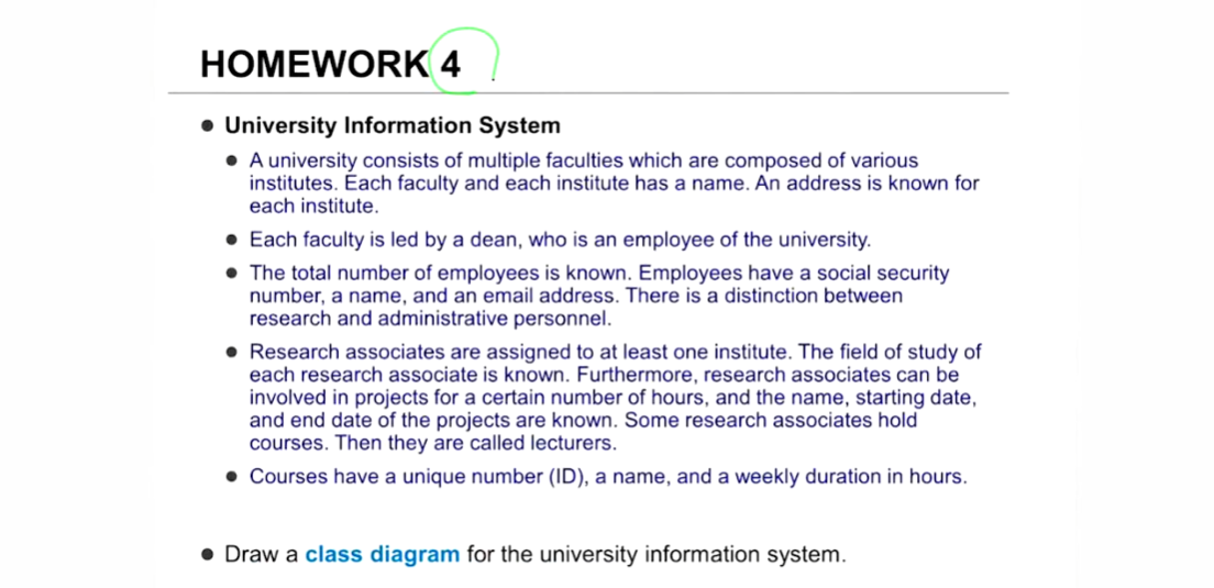 Ans 가게 하나에 오더 한개씩은? 의문이 좀 드는 부분 만든사람의 의도를 알 있고, student랑 강의실이랑 연결되어야하는데 안되어 있음.(빨간색 줄) 추가로 제일 왼쪽이랑 밑이랑 구성도 몇대몇인지 how to many 개수도 안적어 놓음 이건 그냥 참고용으로 이런 그림도 나올수 있음을 참고하라