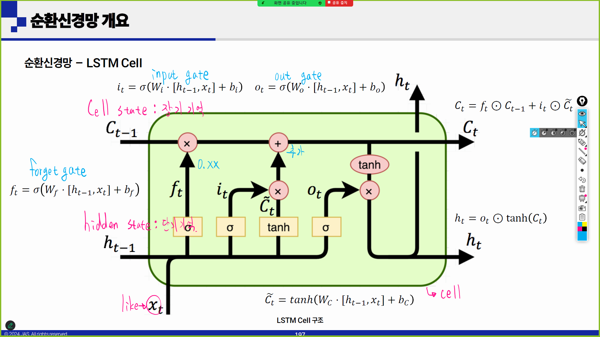 장기 의존성 문제를 보완하기 위해 제안된 구조로 셀 상태를 추가한 구조 input, forget, output gate가 존재